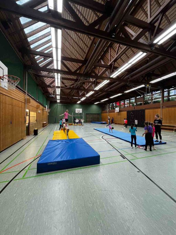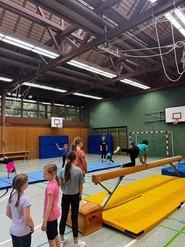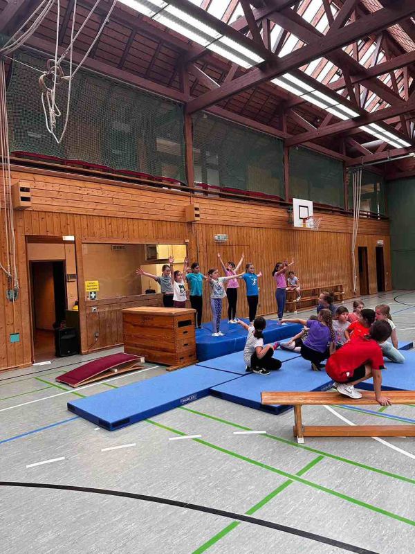 - Wir haben den Bewegungstag in der Sporthalle beim Gerätturnen verbracht. Von Trampolin, über Reck, Schwebebalken bis Boden waren alle Geräte dabei. Sogar eine Aufführung für die Monatsfeier haben wir für euch vorbereitet – seid gespannt!